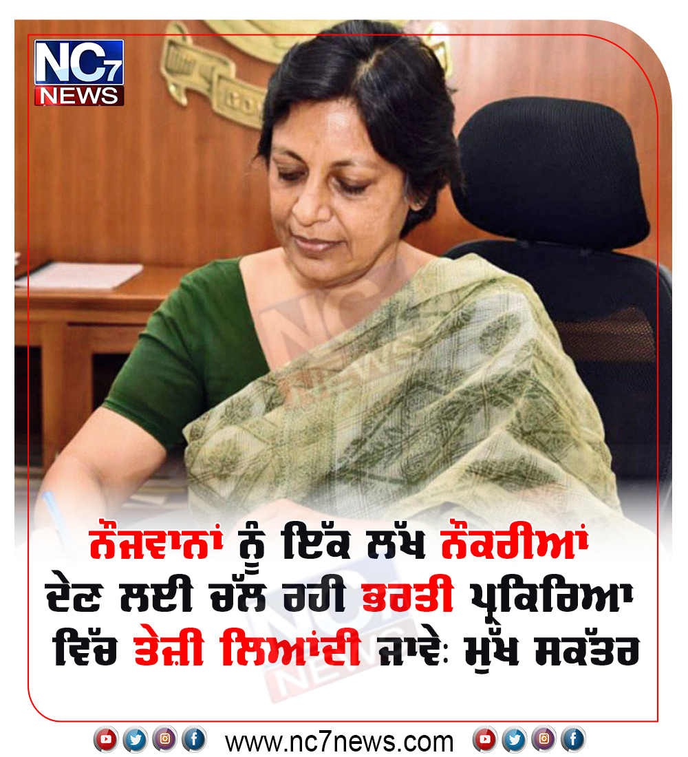 ਚੰਡੀਗੜ੍ਹ, 13 ਜੁਲਾਈ 2021 – ‘ਘਰ ਘਰ ਰੋਜ਼ਗਾਰ ਅਤੇ ਕਾਰੋਬਾਰ ਮਿਸ਼ਨ’ ਤਹਿਤ ਮੁੱਖ ਮੰਤਰੀ ਕੈਪਟਨ ਅਮਰਿੰਦਰ ਸਿੰਘ ਦੇ ਯੋਗ ਬੇਰੁਜ਼ਗਾਰ ਨੌਜਵਾਨਾਂ ਨੂੰ ਰੋਜ਼ਗਾਰ ਦੇ ਮੌਕੇ ਪ੍ਰਦਾਨ ਕਰਨ ਦੇ ਸੁਪਨੇ ਨੂੰ ਸਾਕਾਰ ਕਰਨ ਲਈ ਮੁੱਖ ਸਕੱਤਰ ਸ੍ਰੀਮਤੀ ਵਿਨੀ ਮਹਾਜਨ ਨੇ ਅੱਜ ਇੱਥੇ ਸਾਰੇ ਵਿਭਾਗਾਂ ਨੂੰ ਨਿਰਦੇਸ਼ ਦਿੱਤੇ ਕਿ ਮੈਰਿਟ ਦੇ ਆਧਾਰ ’ਤੇ ਯੋਗ ਉਮੀਦਵਾਰਾਂ ਨੂੰ ਇਕ ਲੱਖ ਸਰਕਾਰੀ ਨੌਕਰੀਆਂ ਦੇਣ ਦੇ ਟੀਚੇ ਨੂੰ ਪ੍ਰਾਪਤ ਕਰਨ ਲਈ ਚੱਲ ਰਹੀ ਭਰਤੀ ਮੁਹਿੰਮ ਦੀ ਪ੍ਰਕਿਰਿਆ ਵਿਚ ਤੇਜ਼ੀ ਲਿਆਂਦੀ ਜਾਵੇ।