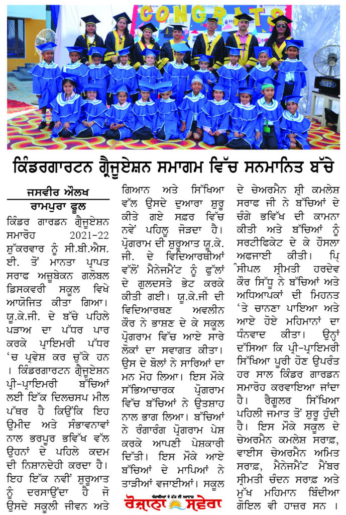 ਜਸਵੀਰ ਔਲਖ । ਰਾਮਪੁਰਾ ਫੂਲ– ਕਿੰਡਰ ਗਾਰਡਨ ਗ੍ਰੈਜੂਏਸ਼ਨ ਸਮਾਰੋਹ 2021-22 ਸ਼ੁੱਕਰਵਾਰ ਨੂੰ ਸੀ.ਬੀ.ਐਸ.ਈ. ਤੋਂ ਮਾਨਤਾ ਪ੍ਰਾਪਤ ਸਰਾਫ ਅਜ਼ੂਬੇਕਨ ਗਲੋਬਲ ਡਿਸਕਵਰੀ ਸਕੂਲ ਵਿਖੇ ਆਯੋਜਿਤ ਕੀਤਾ ਗਿਆ। ਯੂ.ਕੇ.ਜੀ. ਦੇ ਬੱਚੇ ਪਹਿਲੇ ਪੜਾਅ ਦਾ ਪੱਧਰ ਪਾਰ ਕਰਕੇ ਪ੍ਰਾਇਮਰੀ ਪੱਧਰ ‘ਚ ਪ੍ਰਵੇਸ਼ ਕਰ ਚੁੱਕੇ ਹਨ । ਕਿੰਡਰਗਾਰਟਨ ਗ੍ਰੈਜੂਏਸ਼ਨ ਪ੍ਰੀ-ਪ੍ਰਾਇਮਰੀ ਬੱਚਿਆਂ ਲਈ ਇੱਕ ਦਿਲਚਸਪ ਮੀਲ ਪੱਥਰ ਹੈ ਕਿਉਂਕਿ ਇਹ ਉਮੀਦ ਅਤੇ ਸੰਭਾਵਨਾਵਾਂ ਨਾਲ ਭਰਪੂਰ ਭਵਿੱਖ ਵੱਲ ਉਹਨਾਂ ਦੇ ਪਹਿਲੇ ਕਦਮ ਦੀ ਨਿਸ਼ਾਨਦੇਹੀ ਕਰਦਾ ਹੈ। ਇਹ ਇੱਕ ਨਵੀਂ ਸ਼ੁਰੂਆਤ ਨੂੰ ਦਰਸਾਉਂਦਾ ਹੈ ਜੋ ਉਸਦੇ ਸਕੂਲੀ ਜੀਵਨ ਅਤੇ ਗਿਆਨ ਅਤੇ ਸਿੱਖਿਆ ਵੱਲ ਉਸਦੇ ਦੁਆਰਾ ਸ਼ੁਰੂ ਕੀਤੇ ਗਏ ਸਫ਼ਰ ਵਿੱਚ ਨਵੇਂ ਪਹਿਲੂ ਜੋੜਦਾ ਹੈ। ਪ੍ਰੋਗਰਾਮ ਦੀ ਸ਼ੁਰੂਆਤ ਯੂ.ਕੇ.ਜੀ. ਦੇ ਵਿਦਿਆਰਥੀਆਂ ਵੱਲੋਂ ਮੈਨੇਜਮੈਂਟ ਨੂੰ ਫੁੱਲਾਂ ਦੇ ਗੁਲਦਸਤੇ ਭੇਟ ਕਰਕੇ ਕੀਤੀ ਗਈ। ਯੂ.ਕੇ.ਜੀ ਦੀ ਵਿਦਿਆਰਥਣ ਅਵਲੀਨ ਕੌਰ ਨੇ ਭਾਸ਼ਣ ਦੇ ਕੇ ਸਕੂਲ ਪ੍ਰੋਗਰਾਮ ਵਿੱਚ ਆਏ ਸਾਰੇ ਲੋਕਾਂ ਦਾ ਸਵਾਗਤ ਕੀਤਾ। ਉਸ ਦੇ ਬੋਲਾਂ ਨੇ ਸਾਰਿਆਂ ਦਾ ਮਨ ਮੋਹ ਲਿਆ। ਇਸ ਮੌਕੇ ਸੱਭਿਆਚਾਰਕ ਪ੍ਰੋਗਰਾਮ ਵਿੱਚ ਬੱਚਿਆਂ ਨੇ ਉਤਸ਼ਾਹ ਨਾਲ ਭਾਗ ਲਿਆ। ਬੱਚਿਆਂ ਨੇ ਰੰਗਾਰੰਗ ਪ੍ਰੋਗਰਾਮ ਪੇਸ਼ ਕਰਕੇ ਆਪਣੀ ਪੇਸ਼ਕਾਰੀ ਦਿੱਤੀ। ਇਸ ਮੌਕੇ ਆਏ ਬੱਚਿਆਂ ਦੇ ਮਾਪਿਆਂ ਨੇ ਤਾੜੀਆਂ ਵਜਾਈਆਂ। ਸਕੂਲ ਦੇ ਚੇਅਰਮੈਨ ਸ਼੍ਰੀ ਕਮਲੇਸ਼ ਸਰਾਫ ਜੀ ਨੇ ਬੱਚਿਆਂ ਦੇ ਚੰਗੇ ਭਵਿੱਖ ਦੀ ਕਾਮਨਾ ਕੀਤੀ ਅਤੇ ਬੱਚਿਆਂ ਨੂੰ ਸਰਟੀਫਿਕੇਟ ਦੇ ਕੇ ਹੌਸਲਾ ਅਫਜਾਈ ਕੀਤੀ। ਪਿ੍ੰਸੀਪਲ ਸ੍ਰੀਮਤੀ ਹਰਦੇਵ ਕੌਰ ਸਿੱਧੂ ਨੇ ਬੱਚਿਆਂ ਅਤੇ ਅਧਿਆਪਕਾਂ ਦੀ ਮਿਹਨਤ ‘ਤੇ ਚਾਨਣਾ ਪਾਇਆ ਅਤੇ ਆਏ ਹੋਏ ਮਹਿਮਾਨਾਂ ਦਾ ਧੰਨਵਾਦ ਕੀਤਾ । ਉਨ੍ਹਾਂ ਦੱਸਿਆ ਕਿ ਪ੍ਰੀ-ਪ੍ਰਾਇਮਰੀ ਸਿੱਖਿਆ ਪੂਰੀ ਹੋਣ ਉਪਰੰਤ ਹਰ ਸਾਲ ਕਿੰਡਰ ਗਾਰਡਨ ਸਮਾਰੋਹ ਕਰਵਾਇਆ ਜਾਂਦਾ ਹੈ। ਰੈਗੂਲਰ ਸਿੱਖਿਆ ਪਹਿਲੀ ਜਮਾਤ ਤੋਂ ਸ਼ੁਰੂ ਹੁੰਦੀ ਹੈ। ਇਸ ਮੌਕੇ ਸਕੂਲ ਦੇ ਚੇਅਰਮੈਨ ਕਮਲੇਸ਼ ਸਰਾਫ਼, ਵਾਈਸ ਚੇਅਰਮੈਨ ਅਮਿਤ ਸਰਾਫ਼, ਮੈਨੇਜਮੈਂਟ ਮੈਂਬਰ ਸ੍ਰੀਮਤੀ ਚੰਦਨ ਸਰਾਫ਼ ਅਤੇ ਮੁੱਖ ਮਹਿਮਾਨ ਬਿੰਦੀਆ ਗੋਇਲ ਵੀ ਹਾਜ਼ਰ ਸਨ ।