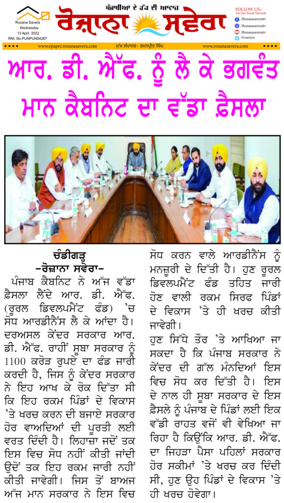 ਚੰਡੀਗੜ੍ਹ : ਪੰਜਾਬ ਕੈਬਨਿਟ ਨੇ ਅੱਜ ਵੱਡਾ ਫ਼ੈਸਲਾ ਲੈਂਦੇ ਆਰ. ਡੀ. ਐੱਫ. (ਰੂਰਲ ਡਿਵਲਪਮੈਂਟ ਫੰਡ) ’ਚ ਸੋਧ ਆਰਡੀਨੈਂਸ ਲੈ ਕੇ ਆਂਦਾ ਹੈ। ਦਰਅਸਲ ਕੇਂਦਰ ਸਰਕਾਰ ਆਰ. ਡੀ. ਐੱਫ. ਰਾਹੀਂ ਸੂਬਾ ਸਰਕਾਰ ਨੂੰ 1100 ਕਰੋੜ ਰੁਪਏ ਦਾ ਫੰਡ ਜਾਰੀ ਕਰਦੀ ਹੈ, ਜਿਸ ਨੂੰ ਕੇਂਦਰ ਸਰਕਾਰ ਨੇ ਇਹ ਆਖ ਕੇ ਰੋਕ ਦਿੱਤਾ ਸੀ ਕਿ ਇਹ ਰਕਮ ਪਿੰਡਾਂ ਦੇ ਵਿਕਾਸ ’ਤੇ ਖਰਚ ਕਰਨ ਦੀ ਬਜਾਏ ਸਰਕਾਰ ਹੋਰ ਵਾਅਦਿਆਂ ਦੀ ਪੂਰਤੀ ਲਈ ਵਰਤ ਦਿੰਦੀ ਹੈ। ਲਿਹਾਜ਼ਾ ਜਦੋਂ ਤਕ ਇਸ ਵਿਚ ਸੋਧ ਨਹੀਂ ਕੀਤੀ ਜਾਂਦੀ ਉਦੋਂ ਤਕ ਇਹ ਰਕਮ ਜਾਰੀ ਨਹੀਂ ਕੀਤੀ ਜਾਵੇਗੀ। ਜਿਸ ਤੋਂ ਬਾਅਜ ਅੱਜ ਮਾਨ ਸਰਕਾਰ ਨੇ ਇਸ ਵਿਚ ਸੋਧ ਕਰਨ ਵਾਲੇ ਆਰਡੀਨੈਂਸ ਨੂੰ ਮਨਜ਼ੂਰੀ ਦੇ ਦਿੱਤੀ ਹੈ। ਹੁਣ ਰੂਰਲ ਡਿਵਲਪਮੈਂਟ ਫੰਡ ਤਹਿਤ ਜਾਰੀ ਹੋਣ ਵਾਲੀ ਰਕਮ ਸਿਰਫ ਪਿੰਡਾਂ ਦੇ ਵਿਕਾਸ ’ਤੇ ਹੀ ਖਰਚ ਕੀਤੀ ਜਾਵੇਗੀ।