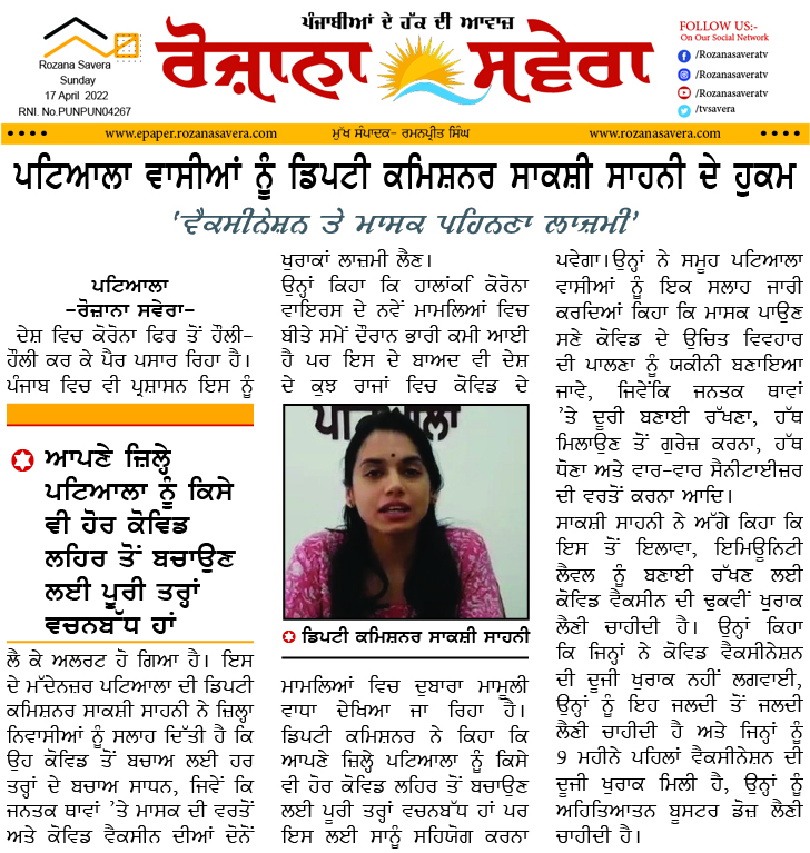 ਪਟਿਆਲਾ.-ਰੋਜ਼ਾਨਾ ਸਵੇਰਾ-ਦੇਸ਼ ਵਿਚ ਕੋਰੋਨਾ ਫਿਰ ਤੋਂ ਹੌਲੀ-ਹੌਲੀ ਕਰ ਕੇ ਪੈਰ ਪਸਾਰ ਰਿਹਾ ਹੈ। ਪੰਜਾਬ ਵਿਚ ਵੀ ਪ੍ਰਸ਼ਾਸਨ ਇਸ ਨੂੰ ਲੈ ਕੇ ਅਲਰਟ ਹੋ ਗਿਆ ਹੈ। ਇਸ ਦੇ ਮੱਦੇਨਜ਼ਰ ਪਟਿਆਲਾ ਦੀ ਡਿਪਟੀ ਕਮਿਸ਼ਨਰ ਸਾਕਸ਼ੀ ਸਾਹਨੀ ਨੇ ਜ਼ਿਲ੍ਹਾ ਨਿਵਾਸੀਆਂ ਨੂੰ ਸਲਾਹ ਦਿੱਤੀ ਹੈ ਕਿ ਉਹ ਕੋਵਿਡ ਤੋਂ ਬਚਾਅ ਲਈ ਹਰ ਤਰ੍ਹਾਂ ਦੇ ਬਚਾਅ ਸਾਧਨ, ਜਿਵੇਂ ਕਿ ਜਨਤਕ ਥਾਵਾਂ ’ਤੇ ਮਾਸਕ ਦੀ ਵਰਤੋਂ ਅਤੇ ਕੋਵਿਡ ਵੈਕਸੀਨ ਦੀਆਂ ਦੋਨੋਂ ਖੁਰਾਕਾਂ ਲਾਜ਼ਮੀ ਲੈਣ।