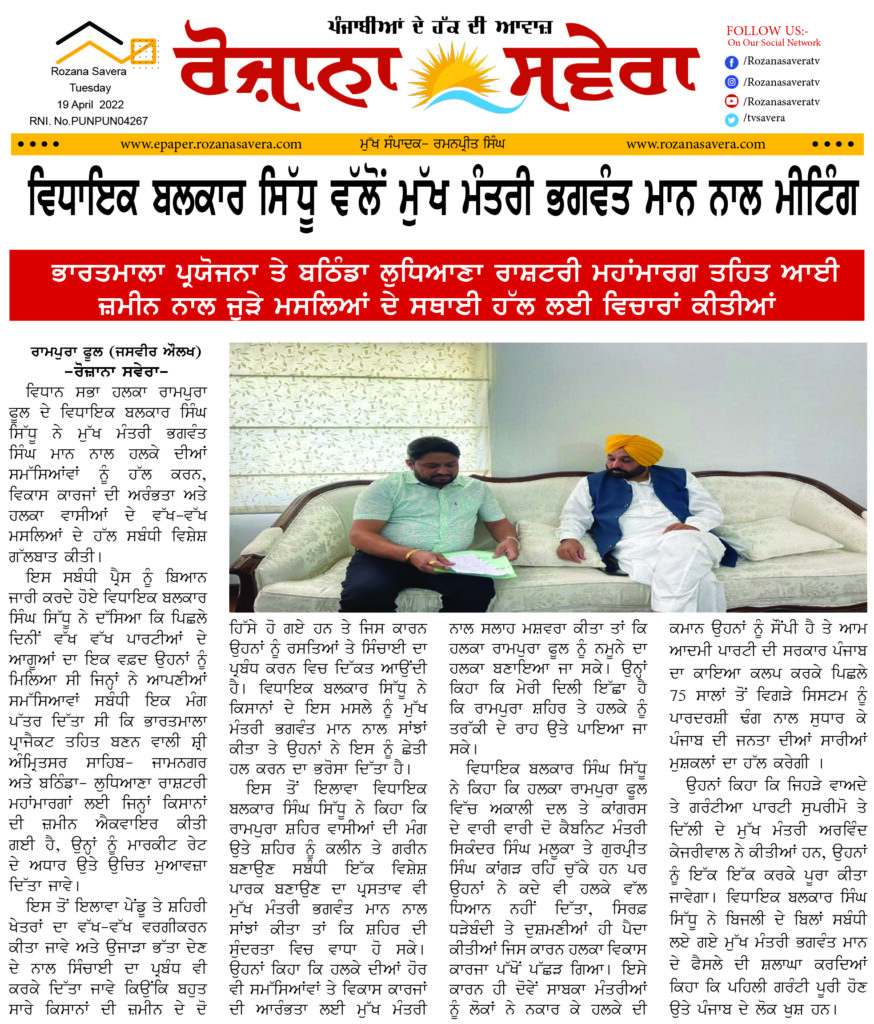 ਰਾਮਪੁਰਾ ਫੂਲ(ਜਸਵੀਰ ਔਲਖ): ਵਿਧਾਨ ਸਭਾ ਹਲਕਾ ਰਾਮਪੁਰਾ ਫੂਲ ਦੇ ਵਿਧਾਇਕ ਬਲਕਾਰ ਸਿੰਘ ਸਿੱਧੂ ਨੇ ਮੁੱਖ ਮੰਤਰੀ ਭਗਵੰਤ ਸਿੰਘ ਮਾਨ ਨਾਲ ਹਲਕੇ ਦੀਆਂ ਸਮੱਸਿਆਂਵਾਂ ਨੂੰ ਹੱਲ ਕਰਨ, ਵਿਕਾਸ ਕਾਰਜਾਂ ਦੀ ਅਰੰਭਤਾ ਅਤੇ ਹਲਕਾ ਵਾਸੀਆਂ ਦੇ ਵੱਖ-ਵੱਖ ਮਸਲਿਆਂ ਦੇ ਹੱਲ ਸਬੰਧੀ ਵਿਸ਼ੇਸ਼ ਗੱਲਬਾਤ ਕੀਤੀ।
