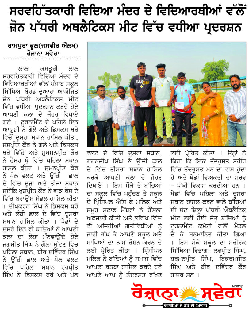 ਲਾਲਾ ਕਸਤੂਰੀ ਲਾਲ ਸਰਵਹਿਤਕਾਰੀ ਵਿਦਿਆ ਮੰਦਰ ਦੇ ਵਿਦਿਆਰਥੀਆਂ ਵੱਲੋਂ ਪੰਜਾਬ ਸਕੂਲ ਸਿੱਖਿਆ ਬੋਰਡ ਦੁਆਰਾ ਆਯੋਜਿਤ ਜ਼ੋਨ ਪੱਧਰੀ ਅਥਲੈਟਿਕਸ ਮੀਟ ਵਿੱਚ ਵਧੀਆ ਪ੍ਰਦਰਸ਼ਨ ਕਰਦੇ ਹੋਏ ਆਪਣੀ ਕਲਾ ਦੇ ਜੌਹਰ ਵਿਖਾਏ ਗਏ । ਟੂਰਨਾਮੈਂਟ ਦੇ ਪਹਿਲੇ ਦਿਨ ਆਯੁਸ਼ੀ ਨੇ ਗੋਲੇ ਅਤੇ ਡਿਸਕਸ ਥਰੋ ਵਿਚੋਂ ਦੂਸਰਾ ਸਥਾਨ ਹਾਸਿਲ ਕੀਤਾ, ਜਸਪ੍ਰੀਤ ਕੌਰ ਨੇ ਗੋਲੇ ਅਤੇ ਡਿਸਕਸ ਥਰੋ ਵਿੱਚੋਂ ਅਤੇ ਸੁਖਮਨਪ੍ਰੀਤ ਕੌਰ ਨੇ ਹੈਮਰ ਥ੍ਰੋ ਵਿੱਚ ਪਹਿਲਾ ਸਥਾਨ ਹਾਸਲ ਕੀਤਾ । ਸੁਮਨਪ੍ਰੀਤ ਕੌਰ ਨੇ ਪੋਲ ਵਲਟ ਅਤੇ ਉੱਚੀ ਛਾਲ ਦੇ ਵਿੱਚ ਦੂਜਾ ਅਤੇ ਤੀਜਾ ਸਥਾਨ ਜਦੋਂਕਿ ਖੁਸ਼ਪ੍ਰੀਤ ਕੌਰ ਨੇ ਵਾਕ ਰੇਸ ਦੇ ਵਿੱਚ ਬਰਾਉਂਸ ਮੈਡਲ ਹਾਸਿਲ ਕੀਤਾ । ਦੀਪਕਰਨ ਸਿੰਘ ਨੇ ਡਿਸਕਸ ਥਰੋ ਅਤੇ ਲੰਬੀ ਛਾਲ ਦੇ ਵਿੱਚ ਦੂਸਰਾ ਸਥਾਨ ਹਾਸਿਲ ਕੀਤਾ । ਖੇਡਾਂ ਦੇ ਦੂਸਰੇ ਦਿਨ ਵੀ ਬੱਚਿਆਂ ਨੇ ਆਪਣੀ ਕਲਾ ਦਾ ਲੋਹਾ ਮੰਨਵਾਉਂਦੇ ਹੋਏ ਜਗਮੀਤ ਸਿੰਘ ਨੇ ਗੋਲਾ ਸੁੱਟਣ ਵਿਚ ਪਹਿਲਾ ਸਥਾਨ, ਬੀਰ ਦਵਿੰਦਰ ਸਿੰਘ ਨੇ ਉੱਚੀ ਛਾਲ ਅਤੇ ਪੋਲ ਵਲਟ ਵਿੱਚ ਪਹਿਲਾ ਸਥਾਨ ਹਰਪ੍ਰੀਤ ਸਿੰਘ ਨੇ ਡਿਸਕਸ ਥਰੋ ਅਤੇ ਪੋਲ ਵਲਟ ਦੇ ਵਿੱਚ ਦੂਸਰਾ ਸਥਾਨ, ਗਗਨਦੀਪ ਸਿੰਘ ਨੇ ਉੱਚੀ ਛਾਲ ਦੇ ਵਿੱਚ ਤੀਸਰਾ ਸਥਾਨ ਹਾਸਿਲ ਕਰਕੇ ਆਪਣੀ ਕਲਾ ਦੇ ਜੌਹਰ ਦਿਖਾਏ । ਇਸ ਮੌਕੇ ਤੇ ਬੱਚਿਆਂ ਦਾ ਸਕੂਲ ਵਿੱਚ ਪਹੁੰਚਣ ਤੇ ਸਕੂਲ ਦੇ ਪ੍ਰਿੰਸਿਪਲ ਐੱਸ ਕੇ ਮਲਿਕ ਅਤੇ ਸਮੂਹ ਸਟਾਫ਼ ਮੈਂਬਰਾਂ ਨੇ ਹੌਂਸਲਾ ਅਫਜ਼ਾਈ ਕੀਤੀ ਅਤੇ ਭਵਿੱਖ ਵਿੱਚ ਵੀ ਅਜਿਹੀਆਂ ਗਤੀਵਿਧੀਆਂ ਨੂੰ ਜਾਰੀ ਰੱਖ ਕੇ ਆਪਣੇ ਸਕੂਲ ਅਤੇ ਮਾਪਿਆਂ ਦਾ ਨਾਮ ਰੋਸ਼ਨ ਕਰਨ ਦੇ ਲਈ ਪ੍ਰੇਰਿਤ ਕੀਤਾ । ਪ੍ਰਿੰਸੀਪਲ ਮਲਿਕ ਨੇ ਬੱਚਿਆਂ ਨੂੰ ਸਮਾਜ ਵਿੱਚ ਆਪਣਾ ਰੁਤਬਾ ਹਾਸਿਲ ਕਰਦੇ ਹੋਏ ਆਪਣੇ ਆਪ ਨੂੰ ਤੰਦਰੁਸਤ ਰੱਖਣ ਲਈ ਪ੍ਰੇਰਿਤ ਕੀਤਾ । ਉਨ੍ਹਾਂ ਨੇ ਕਿਹਾ ਕਿ ਇੱਕ ਤੰਦਰੁਸਤ ਸ਼ਰIਰ ਵਿੱਚ ਤੰਦਰੁਸਤ ਮਨ ਦਾ ਵਾਸ ਹੁੰਦਾ ਹੈ ਅਤੇ ਖੇਡਾਂ ਵਿਅਕਤੀ ਦਾ ਸਰਵ – ਪੱਖੀ ਵਿਕਾਸ ਕਰਦੀਆਂ ਹਨ । ਖੇਡਾਂ ਵਿੱਚ ਪਹਿਲਾ ਅਤੇ ਦੂਸਰਾ ਸਥਾਨ ਹਾਸਲ ਕਰਨ ਵਾਲੇ ਬੱਚਿਆਂ ਦੀ ਚੋਣ ਜ਼ਿਲ੍ਹਾ ਪੱਧਰੀ ਐਥਲੈਟਿਕ ਮੀਟ ਲਈ ਹੋਈ ਜੇਤੂ ਬੱਚਿਆਂ ਨੂੰ ਟੂਰਨਾਮੈਂਟ ਕਮੇਟੀ ਵੱਲੋਂ ਮੈਡਲ ਦੇ ਕੇ ਸਨਮਾਨਿਤ ਕੀਤਾ ਗਿਆ । ਇਸ ਮੌਕੇ ਸਕੂਲ ਦਾ ਸਰੀਰਕ ਸਿੱਖਿਆ ਵਿਭਾਗ- ਲਵਪ੍ਰੀਤ ਸਿੰਘ, ਹਰਮਨਪ੍ਰੀਤ ਸਿੰਘ, ਬਿਕਰਮਜੀਤ ਸਿੰਘ ਅਤੇ ਬੀਰ ਦਵਿੰਦਰ ਕੌਰ ਹਾਜ਼ਰ ਸਨ ।