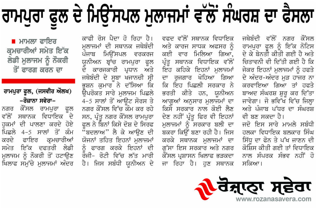ਰਾਮਪੁਰਾ ਫੂਲ, (ਜਸਵੀਰ ਔਲਖ)- ਨਗਰ ਕੌਂਸਲ ਰਾਮਪੁਰਾ ਫੂਲ ਵੱਲੋਂ ਸਥਾਨਕ ਵਿਧਾਇਕ ਦੇ ਹੁਕਮਾਂ ਦੀ ਪਾਲਣਾ ਕਰਦੇ ਹੋਏ ਪਿਛਲੇ 4-5 ਸਾਲਾਂ ਤੋਂ ਕੰਮ ਕਰਦੇ ਫਾਇਰ ਕ੍ਰਮਚਾਰੀਆਂ ਸਮੇਤ ਇੱਕ ਦਫਤਰੀ ਲੇਡੀ ਮੁਲਾਜਮ ਨੂੰ ਨੌਕਰੀ ਤੋਂ ਹਟਾਉਣ ਖਿਲਾਫ ਸਮੁੱਚੇ ਮੁਲਾਜਮਾਂ ਅੰਦਰ ਕਾਫੀ ਰੋਸ ਪੈਦਾ ਹੋ ਰਿਹਾ ਹੈ। ਮੁਲਾਜਮਾਂ ਦੀ ਸਥਾਨਕ ਜਥੇਬੰਦੀ ਪੰਜਾਬ ਮਿਉਂਸਪਲ ਵਰਕਰਜ ਯੂਨੀਅਨ ਬ੍ਰਾਂਚ ਰਾਮਪੁਰਾ ਫੂਲ ਦੇ ਕਾਰਜਕਾਰੀ ਪ੍ਰਧਾਨ ਅਤੇ ਜਥੇਬੰਦੀ ਦੇ ਸੂਬਾ ਖਜਾਨਚੀ ਸ੍ਰੀ ਭੂਸ਼ਨ ਕੁਮਾਰ ਨੇ ਦੱਸਿਆ ਕਿ ਉਪਰੋਕਤ ਸਾਰੇ ਮੁਲਾਜਮ ਪਿਛਲੇ 4-5 ਸਾਲਾਂ ਤੋਂ ਆਊਟ ਸੋਰਸ ਤੇ ਨਗਰ ਕੌਂਸਲ ਵਿੱਚ ਕੰਮ ਕਰ ਰਹੇ ਸਨ, ਪ੍ਰੰਤੂ ਨਗਰ ਕੌਂਸਲ ਰਾਮਪੁਰਾ ਫੂਲ ਨੇ ਬਿਨਾਂ ਕਿਸੇ ਦੋਸ਼ ਦੇ ਸਿਰਫ “ਬਦਲਾਅ” ਲੈ ਕੇ ਆਉਣ ਦੀ ਯੋਜਨਾਂ ਤਹਿਤ ਇਹਨਾਂ ਮੁਲਾਜਮਾਂ ਨੂੰ ਫਾਰਗ ਕਰਕੇ ਇਹਨਾਂ ਦੀ ਰੋਜੀ- ਰੋਟੀ ਵਿੱਚ ਲੱਤ ਮਾਰੀ ਹੈ। ਜਿਸ ਸਬੰਧੀ ਯੂਨੀਅਨ ਦੇ ਵਫਦ ਵੱਲੋਂ ਸਥਾਨਕ ਵਿਧਾਇਕ ਅਤੇ ਕਾਰਜ ਸਾਧਕ ਅਫਸਰ ਨੂੰ ਕਈ ਵਾਰ ਮਿਿਲਆ ਗਿਆ, ਪ੍ਰੰਤੂ ਸਥਾਨਕ ਵਿਧਾਇਕ ਵੱਲੋਂ ਇਹ ਕਹਿਕੇ ਇਹਨਾਂ ਮੁਲਾਜਮਾਂ ਦਾ ਰੁਜਗਾਰ ਖੋਹਿਆ ਗਿਆ ਕਿ ਇਹ ਪਿਛਲੀ ਸਰਕਾਰ ਨੇ ਭਰਤੀ ਕੀਤੇ ਹਨ, ਯੂਨੀਅਨ ਆਗੂਆਂ ਅਨੁਸਾਰ ਮੁਲਾਜਮਾਂ ਦਾ ਕਿਸੇ ਸਰਕਾਰ ਨਾਲ ਕੋਈ ਲੈਣ ਦੇਣ ਨਹੀਂ ਪ੍ਰ੍ਰੰਤੂ ਫਿਰ ਵੀ ਇਹਨਾਂ ਮੁਲਾਜਮਾਂ ਨੂੰ ਸਰਕਾਰ ਬਲੀ ਦਾ ਬਕਰਾ ਕਿਉਂ ਬਣਾ ਰਹੀ ਹੈ। ਜਿਸ ਕਰਕੇ ਸਥਾਨਕ ਮੁਲਾਜਮਾਂ ਦਾ ਗੁੱਸਾ ਇਸ ਸਰਕਾਰ ਅਤੇ ਨਗਰ ਕੌਂਸਲ ਪ੍ਰਸ਼ਾਸਨ ਖਿਲਾਫ ਭੜਕਦਾ ਜਾ ਰਿਹਾ ਹੈ। ਹੁਣ ਸਥਾਨਕ ਜਥੇਬੰਦੀ ਵੱਲੋਂ ਨਗਰ ਕੌਂਸਲ ਰਾਮਪੁਰਾ ਫੂਲ ਨੂੰ ਇੱਕ ਨੋਟਿਸ ਦੇ ਕੇ ਬੇਨਤੀ ਕੀਤੀ ਗਈ ਹੈ ਅਤੇ ਚਿਤਾਵਨੀ ਵੀ ਦਿੱਤੀ ਗਈ ਹੈ ਕਿ ਜੇਕਰ ਇਹਨਾਂ ਮੁਲਾਜਮਾਂ ਨੂੰ ਹਫਤੇ ਦੇ ਅੰਦਰ-ਅੰਦਰ ਮੁੜ ਹਾਜਰ ਨਾ ਕਰਵਾਇਆ ਗਿਆ ਤਾਂ ਹਫਤੇ ਬਾਅਦ ਸੰਘਰਸ਼ ਸ਼ੁਰੂ ਕਰ ਦਿੱਤਾ ਜਾਵੇਗਾ। ਜੋ ਭਵਿੱਖ ਵਿੱਚ ਜਿਲ੍ਹਾ ਅਤੇ ਪੰਜਾਬ ਪੱਧਰ ਦਾ ਸੰਘਰਸ਼ ਵੀ ਬਣ ਸਕਦਾ ਹੈ।