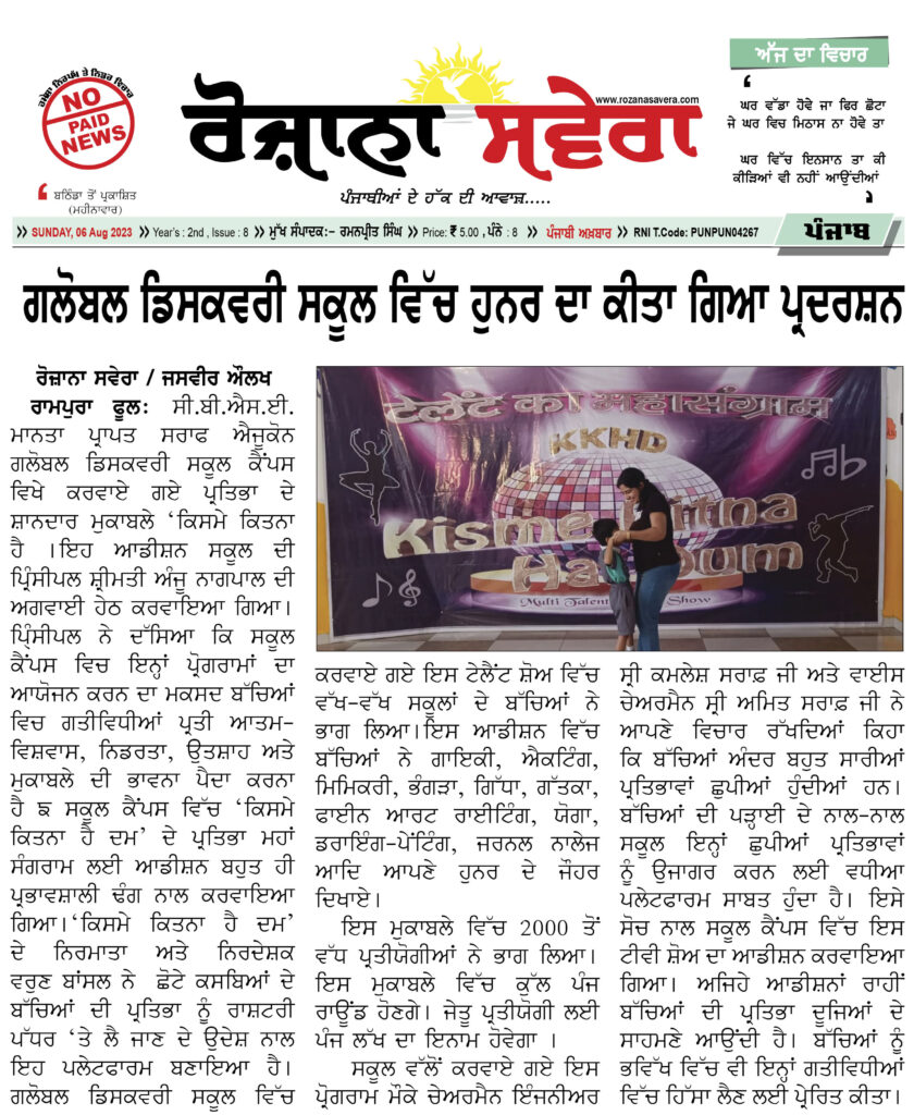 ਰਾਮਪੁਰਾ ਫੂਲ(ਜਸਵੀਰ ਔਲਖ):-ਸੀ.ਬੀ.ਐਸ.ਈ. ਮਾਨਤਾ ਪ੍ਰਾਪਤ ਸਰਾਫ ਐਜੂਕੋਨ ਗਲੋਬਲ ਡਿਸਕਵਰੀ ਸਕੂਲ ਕੈਂਪਸ ਵਿਖੇ ਕਰਵਾਏ ਗਏ ਪ੍ਰਤਿਭਾ ਦੇ ਸ਼ਾਨਦਾਰ ਮੁਕਾਬਲੇ ‘ਕਿਸਮੇ ਕਿਤਨਾ ਹੈ ।ਇਹ ਆਡੀਸ਼ਨ ਸਕੂਲ ਦੀ ਪ੍ਰਿੰਸੀਪਲ ਸ਼੍ਰੀਮਤੀ ਅੰਜੂ ਨਾਗਪਾਲ ਦੀ ਅਗਵਾਈ ਹੇਠ ਕਰਵਾਇਆ ਗਿਆ। ਪਿ੍ੰਸੀਪਲ ਨੇ ਦੱਸਿਆ ਕਿ ਸਕੂਲ ਕੈਂਪਸ ਵਿਚ ਇਨ੍ਹਾਂ ਪ੍ਰੋਗਰਾਮਾਂ ਦਾ ਆਯੋਜਨ ਕਰਨ ਦਾ ਮਕਸਦ ਬੱਚਿਆਂ ਵਿਚ ਗਤੀਵਿਧੀਆਂ ਪ੍ਰਤੀ ਆਤਮ-ਵਿਸ਼ਵਾਸ, ਨਿਡਰਤਾ, ਉਤਸ਼ਾਹ ਅਤੇ ਮੁਕਾਬਲੇ ਦੀ ਭਾਵਨਾ ਪੈਦਾ ਕਰਨਾ ਹੈ | ਸਕੂਲ ਕੈਂਪਸ ਵਿੱਚ ‘ਕਿਸਮੇ ਕਿਤਨਾ ਹੈ ਦਮ’ ਦੇ ਪ੍ਰਤਿਭਾ ਮਹਾਂ ਸੰਗਰਾਮ ਲਈ ਆਡੀਸ਼ਨ ਬਹੁਤ ਹੀ ਪ੍ਰਭਾਵਸ਼ਾਲੀ ਢੰਗ ਨਾਲ ਕਰਵਾਇਆ ਗਿਆ।’ਕਿਸਮੇ ਕਿਤਨਾ ਹੈ ਦਮ’ ਦੇ ਨਿਰਮਾਤਾ ਅਤੇ ਨਿਰਦੇਸ਼ਕ ਵਰੁਣ ਬਾਂਸਲ ਨੇ ਛੋਟੇ ਕਸਬਿਆਂ ਦੇ ਬੱਚਿਆਂ ਦੀ ਪ੍ਰਤਿਭਾ ਨੂੰ ਰਾਸ਼ਟਰੀ ਪੱਧਰ ‘ਤੇ ਲੈ ਜਾਣ ਦੇ ਉਦੇਸ਼ ਨਾਲ ਇਹ ਪਲੇਟਫਾਰਮ ਬਣਾਇਆ ਹੈ। ਗਲੋਬਲ ਡਿਸਕਵਰੀ ਸਕੂਲ ਵਿੱਚ ਕਰਵਾਏ ਗਏ ਇਸ ਟੇਲੈਂਟ ਸ਼ੋਅ ਵਿੱਚ ਵੱਖ-ਵੱਖ ਸਕੂਲਾਂ ਦੇ ਬੱਚਿਆਂ ਨੇ ਭਾਗ ਲਿਆ।ਇਸ ਆਡੀਸ਼ਨ ਵਿੱਚ ਬੱਚਿਆਂ ਨੇ ਗਾਇਕੀ, ਐਕਟਿੰਗ, ਮਿਮਿਕਰੀ, ਭੰਗੜਾ, ਗਿੱਧਾ, ਗੱਤਕਾ, ਫਾਈਨ ਆਰਟ ਰਾਈਟਿੰਗ, ਯੋਗਾ, ਡਰਾਇੰਗ-ਪੇਂਟਿੰਗ, ਜਰਨਲ ਨਾਲੇਜ ਆਦਿ ਆਪਣੇ ਹੁਨਰ ਦੇ ਜੌਹਰ ਦਿਖਾਏ।
