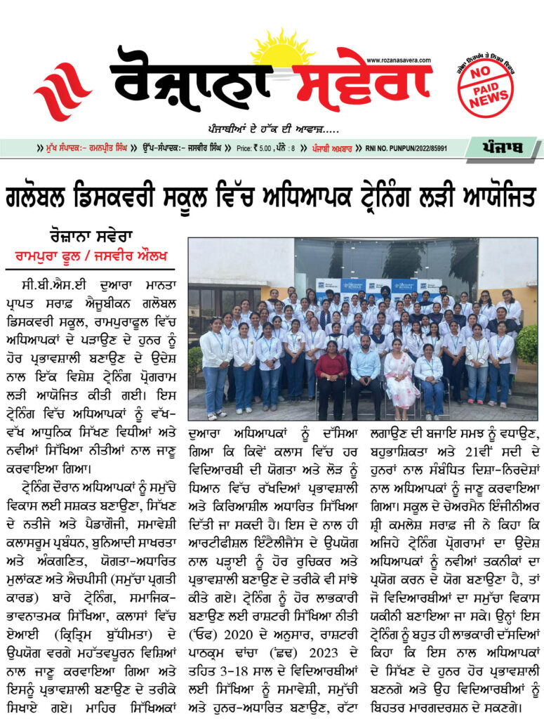 ਸੀ.ਬੀ.ਐਸ.ਈ ਦੁਆਰਾ ਮਾਨਤਾ ਪ੍ਰਾਪਤ ਸਰਾਫ਼ ਐਜੂਬੀਕਨ ਗਲੋਬਲ ਡਿਸਕਵਰੀ ਸਕੂਲ, ਰਾਮਪੁਰਾਫੂਲ ਵਿੱਚ ਅਧਿਆਪਕਾਂ ਦੇ ਪੜਾਉਣ ਦੇ ਹੁਨਰ ਨੂੰ ਹੋਰ ਪ੍ਰਭਾਵਸ਼ਾਲੀ ਬਣਾਉਣ ਦੇ ਉਦੇਸ਼ ਨਾਲ ਇੱਕ ਵਿਸ਼ੇਸ਼ ਟ੍ਰੇਨਿੰਗ ਪ੍ਰੋਗਰਾਮ ਲੜੀ ਆਯੋਜਿਤ ਕੀਤੀ ਗਈ। ਇਸ ਟ੍ਰੇਨਿੰਗ ਵਿੱਚ ਅਧਿਆਪਕਾਂ ਨੂੰ ਵੱਖ-ਵੱਖ ਆਧੁਨਿਕ ਸਿੱਖਣ ਵਿਧੀਆਂ ਅਤੇ ਨਵੀਆਂ ਸਿੱਖਿਆ ਨੀਤੀਆਂ ਨਾਲ ਜਾਣੂ ਕਰਵਾਇਆ ਗਿਆ।
