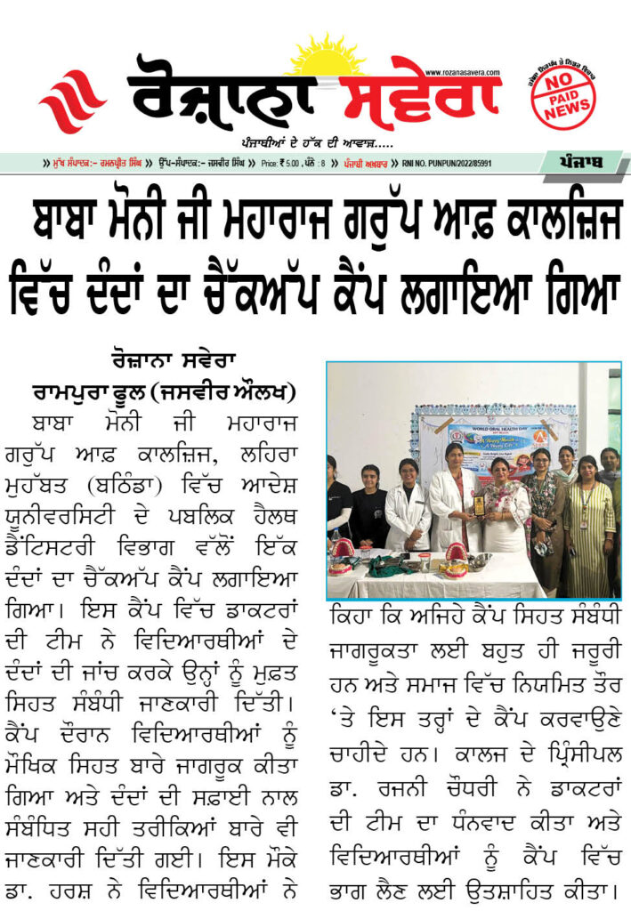 ਬਾਬਾ ਮੋਨੀ ਜੀ ਮਹਾਰਾਜ ਗਰੁੱਪ ਆਫ਼ ਕਾਲਜ਼ਿਜ, ਲਹਿਰਾ ਮੁਹੱਬਤ (ਬਠਿੰਡਾ) ਵਿੱਚ ਆਦੇਸ਼ ਯੂਨੀਵਰਸਿਟੀ ਦੇ ਪਬਲਿਕ ਹੈਲਥ ਡੈਂਟਿਸਟਰੀ ਵਿਭਾਗ ਵੱਲੋਂ ਇੱਕ ਦੰਦਾਂ ਦਾ ਚੈੱਕਅੱਪ ਕੈਂਪ ਲਗਾਇਆ ਗਿਆ। ਇਸ ਕੈਂਪ ਵਿੱਚ ਡਾਕਟਰਾਂ ਦੀ ਟੀਮ ਨੇ ਵਿਦਿਆਰਥੀਆਂ ਦੇ ਦੰਦਾਂ ਦੀ ਜਾਂਚ ਕਰਕੇ ਉਨ੍ਹਾਂ ਨੂੰ ਮੁਫ਼ਤ ਸਿਹਤ ਸੰਬੰਧੀ ਜਾਣਕਾਰੀ ਦਿੱਤੀ। ਕੈਂਪ ਦੌਰਾਨ ਵਿਦਿਆਰਥੀਆਂ ਨੂੰ ਮੌਖਿਕ ਸਿਹਤ ਬਾਰੇ ਜਾਗਰੂਕ ਕੀਤਾ ਗਿਆ ਅਤੇ ਦੰਦਾਂ ਦੀ ਸਫ਼ਾਈ ਨਾਲ ਸੰਬੰਧਿਤ ਸਹੀ ਤਰੀਕਿਆਂ ਬਾਰੇ ਵੀ ਜਾਣਕਾਰੀ ਦਿੱਤੀ ਗਈ। ਇਸ ਮੌਕੇ ਡਾ. ਹਰਸ਼ ਨੇ ਵਿਦਿਆਰਥੀਆਂ ਨੇ ਕਿਹਾ ਕਿ ਅਜਿਹੇ ਕੈਂਪ ਸਿਹਤ ਸੰਬੰਧੀ ਜਾਗਰੂਕਤਾ ਲਈ ਬਹੁਤ ਹੀ ਜਰੂਰੀ ਹਨ ਅਤੇ ਸਮਾਜ ਵਿੱਚ ਨਿਯਮਿਤ ਤੌਰ ‘ਤੇ ਇਸ ਤਰ੍ਹਾਂ ਦੇ ਕੈਂਪ ਕਰਵਾਉਣੇ ਚਾਹੀਦੇ ਹਨ। ਕਾਲਜ ਦੇ ਪ੍ਰਿੰਸੀਪਲ ਡਾ. ਰਜਨੀ ਚੌਧਰੀ ਨੇ ਡਾਕਟਰਾਂ ਦੀ ਟੀਮ ਦਾ ਧੰਨਵਾਦ ਕੀਤਾ ਅਤੇ ਵਿਦਿਆਰਥੀਆਂ ਨੂੰ ਕੈਂਪ ਵਿੱਚ ਭਾਗ ਲੈਣ ਲਈ ਉਤਸ਼ਾਹਿਤ ਕੀਤਾ।