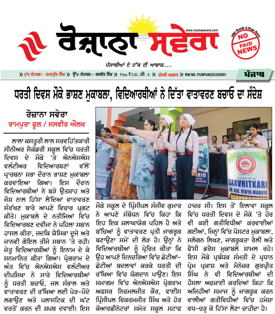 ਰਾਮਪੁਰਾ ਫੂਲ — ਲਾਲਾ ਕਸਤੂਰੀ ਲਾਲ ਸਰਵਹਿੱਤਕਾਰੀ ਸੀਨੀਅਰ ਸੈਕੰਡਰੀ ਸਕੂਲ ਵਿੱਚ ਧਰਤੀ ਦਿਵਸ ਦੇ ਮੌਕੇ ‘ਤੇ ਐਨਐਸਐਸ ਵਲੰਟੀਅਰ ਵਿਦਿਆਰਥਣਾਂ ਵੱਲੋਂ ਪ੍ਰਾਰਥਨਾ ਸਭਾ ਦੌਰਾਨ ਭਾਸ਼ਣ ਮੁਕਾਬਲਾ ਕਰਵਾਇਆ ਗਿਆ। ਇਸ ਦੌਰਾਨ ਵਿਦਿਆਰਥੀਆਂ ਨੇ ਬੜੇ ਉਤਸ਼ਾਹ ਅਤੇ ਜੋਸ਼ ਨਾਲ ਹਿੱਸਾ ਲੈਂਦਿਆਂ ਵਾਤਾਵਰਣ ਸੰਰੱਖਣ ਬਾਰੇ ਆਪਣੇ ਵਿਚਾਰ ਪ੍ਰਗਟ ਕੀਤੇ।